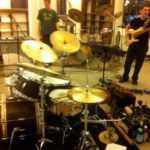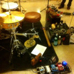 A look behind the kit. My pedal board and mbira (with pickup) in the foreground, and hand percussion behind my throne.